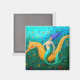 Uma sereia descuidada cavalga um cavalo marinho selvagem num mar brilhante de estrelas-do-mar nesta pintura de fantasia de Sue Halstenberg. Reproduzida a partir da pintura pastel original.