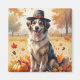 Uma pintura em forma de aquarela de um cão alegre sentado em meio a uma pilha de folhas vibrantes de queda, cercado por pequenas abóboras e bolotas espalhadas. O cachorro veste um chapéu de peregrino e fede de alegria, capturando o espírito da Ação de Graças. No fundo, campos de colheita suaves e árvores abrigadas em ouro criam um ambiente rural pacífico. Texturas gentis e tons de outono aquecidos dão à cena uma sensação acolhedora e nostálgica de celebrar a beleza da estação.
