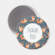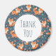Um obrigado que você imprime com um padrão feito com raposas de laranja bonitinhas e felizes. Fundo verde escuro. Pequenos cogumelos e folhas espalhados. Um círculo branco em camadas sobre o topo com o obrigado que você escreveu dentro.