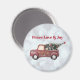 Um ímã de férias com um design de natal fofo. Texto diz: Paz Amor e Joy. Imagem é um belo caminhão de brinquedo com a mão Feliz de Natal pintada ao lado com a inscrição dourada. Carregando uma árvore de Natal decorada nas costas. O fundo é um padrão prateado.