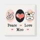 Se você ama vacas, você vai adorar esse símbolo adorável de paz, coração e boi Holstein, preto e branco, mascando numa folha de grama verde com as palavras Peace Love Moo on t-shirts, camisetas, papelaria e mais roupa e mercadoria para qualquer um que ame coleções de vaca. Clique no link a seguir para ver todo o nosso Chrissy H original.