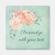 Este design tem um buquê de rosas de cor d'água de pêssego e peônias no canto superior sobre um fundo aqua mutado. Um modelo de texto é incluído que você pode personalizar com o texto desejado.