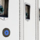 Um feliz dragão fada colorido de pavão voa perto de uma janela enquadrada de tijolos redondos e desfruta das rosa contra um céu azul.
