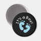 Pegadas de bebê azul em um fundo preto e texto branco que diz "É um menino!" nos botões de anúncio do bebê.