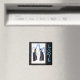 A design neste ímã são dois Pinguins Imperadores virados um para o outro ilustrados com lápis de cor de água. Ao fundo estão pequenos corações amorosos amarelos pintados atrás de dois grandes corações de amor azuis centrados atrás dos pinguins. Enquadrado em uma fina linha de borda branca dentro de uma grossa borda negra. A palavra LOVE está ao lado da imagem.