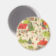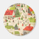 Design com vermelho e verde limão. Aldeia de Natal com árvores decoradas de Natal, casas decoradas, pessoas andando por aí e carros em estradas. Coroa