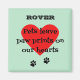 Um ímã com um pensamento adorável para lembrar seu animal de estimação: "Os animais deixam pegadas em nossos corações". Digite o nome do seu animal de estimação para criar um design especial personalizado. Texto preto em um grande coração vermelho, com estampas pretas e um fundo aquoso macio e colorido.