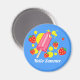 Olá verão, imã desenhada com um tema refrescante e de verão. Um picolé cor-de-rosa e alguns morangos vermelhos caindo ao redor do picolé juntamente com alguns plasmas de tinta amarela. Fundo azul.