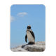 Foto de um pinguim solitário em pé sobre uma rocha contra um céu azul brilhante.