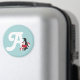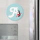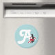Um pinguim está parado com um tubo interno vermelho e branco e uma bola de praia com fundo azul claro. Este desenho animado bonito com monograma personalizado faz um ímã bonito e único para as crianças.