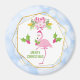 Um produto de natal tropical. Um boque azul e branco, luz de fundo desfocada. Camada sobre o topo, dentro a rico faux gold foil frame, é um rico flamingo rosa com uma perna erguida para cima. Vestindo um chapéu de santa cor-de-rosa e alguns decorativos sazonais sagrados. Um buquê floral acima de sua cabeça com canas doces cruzadas