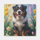 Um cão alegre senta-se pacificamente sobre a relva verde-luxuosa, rodeado por primavera coloridas floridas sob um céu azul macio. Esta pintura digital de óleo captura um momento sereno com pinceladas expressivas, cores quentes e um senso de alegria gentil.