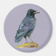 Esta é uma pintura aquosa de corvo. Acho que corvos têm belas penas - pretas, mas refletem cor roxa e azul sob a luz do sol. Este corvo está empoleirado em um tronco de árvore que tem musgo crescendo no topo dele.