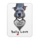 Este adorável ímã diz, "Eu te amo", escreveu dentro de um coração de prata e as palavras "Amor de Bully." O coração prateado está preso nas patas de um bonito Pitbull chamado Sarge. Com sua cabeça inclinada em sua direção, suas orelhas batendo, e seus olhos amorosos olhando diretamente para você, Sarge torna esse ímã perfeito para cada amante de Pitbull.