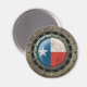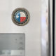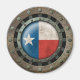 Este gráfico exclusivo apresenta a bandeira do dentro do Texas definida de uma estrutura metálica circular. A bandeira texana tem a aparência de estar debaixo de um pedaço de vidro com um reflexo de luz visível no topo da design. A bandeira tem uma textura áspera adicionada que contrasta o acabamento liso da armação de aço inoxidável. Grandes rebites aparecem na estrutura circular, o que dá ao padrão uma forte aparência industrial. As chapas de aço envelhecidas são visíveis fora da armação, com uma malha de aço a aparecer atrás. Este design industrial tem uma sensação de galo e é uma na moda para mostrar seu patriotismo.