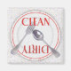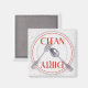 Este ímã de máquina de lavar louça ilustra uma placa janta branca com uma faixa vermelha e uma borda vermelha texturizada, e fotos de um garfo e colher na placa. O prato se senta sobre uma cinza texturizada que parece granito. Ele diz CLEAN em vermelho em um dos lados da placa, com a palavra DIRTY, em letras vermelhas "sujas", no outro lado.