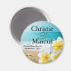 Bonito "Plumeria Starfish Beach", um favor de ímã redondo personalizável. Para perguntas e solicitações, envie um e-mail: glamprettyweddings.com/contact. Convites de casamento, salve as datas, postagem, adesivos redondos e quadrados, cartões RSVP e muito mais estão disponíveis. "Plumeria Starfish Beach" design original por Cheryl Daniels © 2013.
