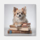 Uma ilustração realista de um cão Pomchi (Pomerânia/Chihuahua) branco e ligeiramente bronzeado sentado sobre uma pilha de livros vindos de couro.