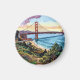 Imagem artística de tirar o fôlego da ponte Ouro de São Francisco que atravessa a baía, com um pôr do sol vibrante, uma costa paisagizada e águas calmas que proporcionam uma atmosfera pitoresca e serena.