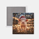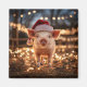 Um ímã quadrado com um porco adorável vestindo um chapéu de Papai Noel e rodeado por luzes cintilantes de Natal.