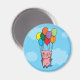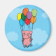 Apresentando uma ilustração digital de porco rosa usando um punhado de balões multicoloridos para voar alto no céu azul nublado.