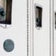 Fotografia detalhada de uma velha porta medieval espanhola feita de cobre e azul manchado, incluindo os rebites.