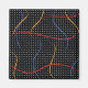 A cor primária do retrato de 1980 traçados de pintura pisca o padrão do platter sobre um fundo geométrico preto e branco pontilhado.