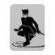 Este gráfico impressionante captura a Mulher-Gato em seu elemento, mostrando sua agilidade e dissimulação enquanto ela se prepara para agir. A ilustração é feita em negrito preto-e-branco, enfatizando a mania de seu traje e o movimento dinâmico de sua pose. A mulher-gato é representada agachada com um chicote enrolado ao seu lado, seu olhar focado e calculista. O efeito de tinta espalhada à sua volta acrescenta uma sensação de urgência e o ambiente caótico em que ela prospera. Esta trabalho de arte não só destaca o status icônico da Mulher Catarina como uma hábil ladra e anti-heroína, como também sua complexa relação com Gotham e seu cavaleiro negro. É uma poderosa representação de um dos mais enigmáticos e formidáveis aliados e adversários de Batman.