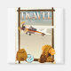 Viagens vintage de Poster - poster clássico de férias de uma aeronave leve voando, há uma mochila no primeiro plano que é emoldurada por madeira velha.