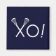 Imagem criativa de presente de lacrosse para jogadores de equipe, treinadores ou fãs desportivos, com paus de lax xo! em fundo azul marinho.