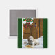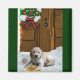 Linda arte de Natal de Goldendoodle. O filhote de Goldendoodle espera na varanda coberta de neve para que Papais noeis cheguem, guardando cookies de Papais noeis. Presentes de Natal maravilhosos, cartões de Natal, postagem, roupa e muito mais.