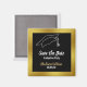 Um boné de formando está acima de 'Salvar a Data' e o nome do formando personalizável em um script em um plano de fundo preto. A data da festa pode ser alterada para a data da sua parte. A borda do olhar de ouro é uma renderização artística (e não uma folha).