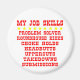Minhas habilidades de trabalho incluem: Solucionador de problemas, Kicks de casas redondas, Retenções de choques, cabeçotes, cortes de upgrades, Desligamentos, Submissões