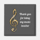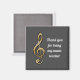 Diga obrigado para seu professor de música ou instrutor de instrumentos com este presente de apreciação. Este ímã quadrado apresenta um belo símbolo de ouro e clave prateada junto com as palavras, "Obrigado por ser meu professor de música". O design inteiro é colocado contra uma cinza escura que pode ser personalizada se você desejar. Personalize o texto de forma rápida e fácil, também para atender às suas necessidades.