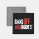 Mostre seu apoio ao direito das mulheres à autonomia corporal com este ímã pró-escolha "Banir nossos corpos", com estilo verde, branco e vermelho, sobre fundo preto.