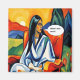 Uma mulher vestida com um vestido branco e azul senta-se numa cadeira laranja numa paisagem de colinas vibrantes e um sol brilhante, perguntando-se 'Qual é aquele cheiro!'