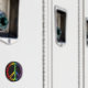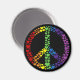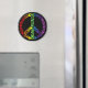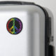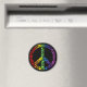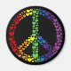 Esse design apresenta corações pequenos, médios e grandes em cores do arco-íris dispostas em forma de sinal de paz, sobre fundo preto.