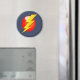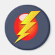 Um gráfico vibrante de um raio amarelo sobre um fundo circular vermelho, simbolizando velocidade, potência e energia, lembrando a iconografia de super-herói.