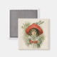 A vintage está pronta para jogar. Seus braços são cheios de bolas de neve e ela está vestindo um chapéu vermelho elegante com penas. As ramificações dos pinos soam o fundo.
