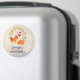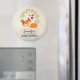 Ímã de salvar a data de aniversário com um fundo bege desgastado e formas geométricas tênues na moda. Sobreposto está um desenho de desenho animado de uma raposa laranja fofa dormindo pacificamente. Uma coroa de folhas verdes com 3 corações vermelhos pequenos por trás.