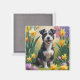 Um cão alegre senta-se pacificamente sobre a relva verde-luxuosa, rodeado por primavera coloridas floridas sob um céu azul macio. Esta pintura digital de óleo captura um momento sereno com pinceladas expressivas, cores quentes e um senso de alegria gentil.