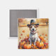 Uma pintura em forma de aquarela de um cão alegre sentado em meio a uma pilha de folhas vibrantes de queda, cercado por pequenas abóboras e bolotas espalhadas. O cachorro veste um chapéu de peregrino e fede de alegria, capturando o espírito da Ação de Graças. No fundo, campos de colheita suaves e árvores abrigadas em ouro criam um ambiente rural pacífico. Texturas gentis e tons de outono aquecidos dão à cena uma sensação acolhedora e nostálgica de celebrar a beleza da estação.