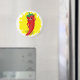 Um personagem de desenho animado de pimenta vermelho e quente. Design original com fundo de tela de tinta amarela. Ímanes personalizados. Ideia do presente.