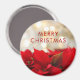Um ímã com uma fotografia festiva de férias com um buquê de poinsetos vermelhos na parte inferior. Luzes de anzol do ouro em segundo plano.