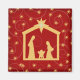 Esta design apresenta a natividade com uma silhueta da família sagrada no estábulo. Mary e Joseph olham para o bebê Jesus na mangueira. O fundo é um bonito vermelho com espirais e estrelas à volta da natividade.