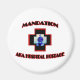 Homem (refém) amarrado numa cadeira com manto de boca tapado, cortado em forma de cruz para enfermeiras. Tudo em um fundo cruzado preto e vermelho com palavras, "Mandation-AKA Hospital Hostage" acima e abaixo do gráfico em fontes modernas preto e vermelho.
