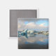 Magnet com reflexo de nuvens e icebergs em Jokulsarlon, lago glaciar na Islândia, onde icebergs colapsam do glaciar Breidamerkurjokull flutuando.