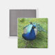 A vibrant peacock, its iridescent plumage partially displayed, stands proudly on a lush green lawn, creating a serene and captivating scene. The majestic peacock's body is predominantly a deep, rich blue, contrasting sharply with the iridescent greens, blues, and browns of its partially displayed tail feathers. These feathers are large and expansive, fanning out behind the peacock's body, but not fully spread in a full "train". The individual "eyes" on the tail feathers are visible, adding to the overall splendour of the bird. Its head is adorned with a small crest of feathers.