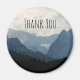 Obrigado imã com uma fotografia de belas montanhas, céu nublado, e colinas rolantes cheias de árvores em primeiro plano. esquema de cor azul da cinza.
