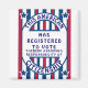 Saia da votação! Perfeito golpe para os eleitores e comícios políticos! Baseado na poster de sufrágio que deveria ser pendurada na janela da casa de uma mulher, esta design originalmente dizia, "uma mulher que vive aqui se registrou para votar, assumindo assim a responsabilidade da cidadania." Esta reformulação das palavras torna-a mais universal para todos os eleitores, independentemente do sexo. É uma afirmação ousada e cores patrióticas que evoca orgulho quando você a vê e ainda mais quando você a tem!